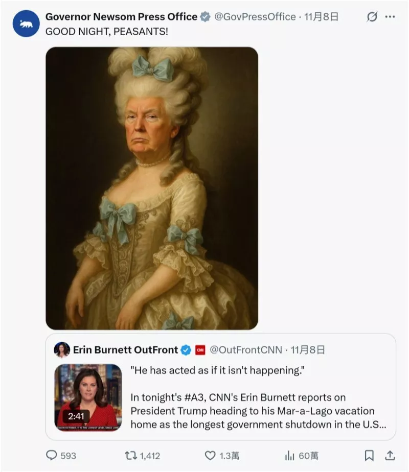加州州长纽森办公室随后转发了伯内特的视频,还附上了一张人工智能生成的法国玛丽王后画像,画中人被换上了特朗普的头,并配文:“晚安了,乡巴佬!”