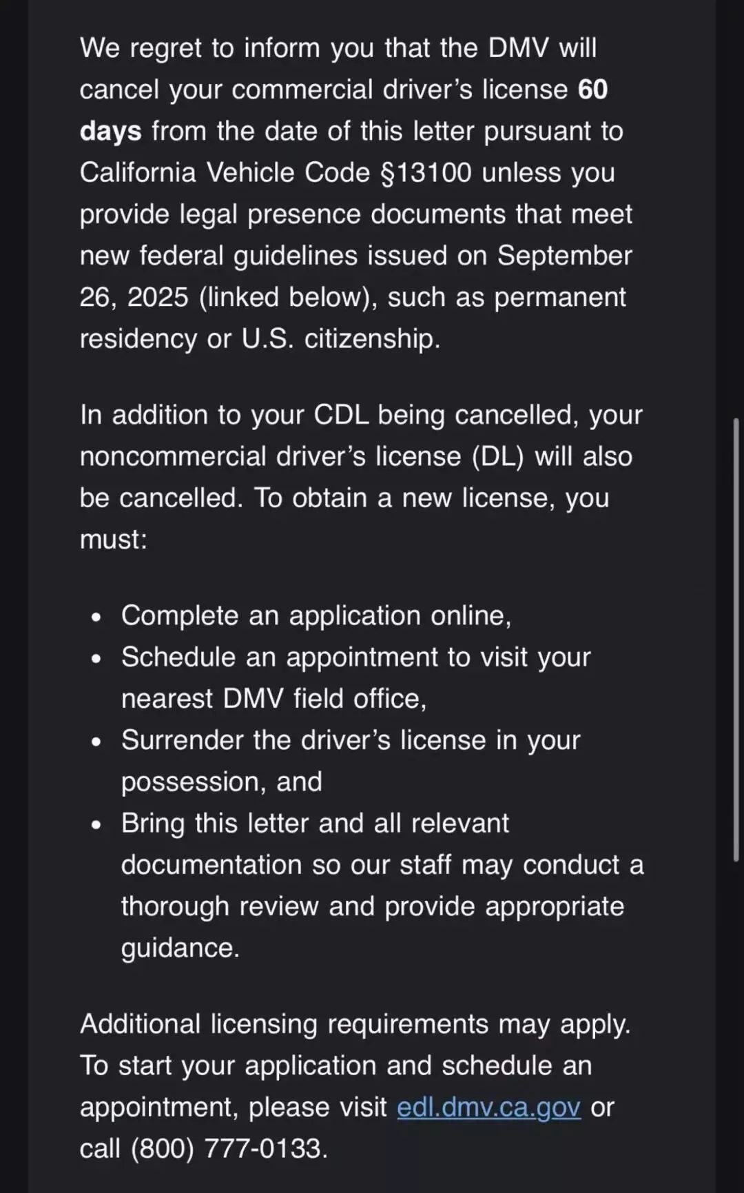我们很遗憾地通知您,根据《加利福尼亚州车辆法》第13100条,自本信之日起60天内,除非您能提供符合2025年9月26日颁布的新联邦指南(链接如下)的合法存在文件,如永久居留权或美国国籍,否则车辆管理局将取消您的商业驾照。