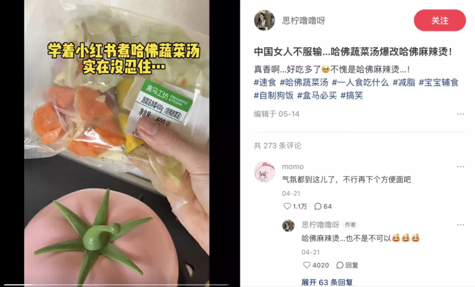 正因为这碗汤太难喝,逼得小红书上的年轻人发挥创意,把哈佛蔬菜汤爆改成麻辣香锅和杨国福麻辣烫。依次加入牛肉丸、魔芋丝、肥牛卷、咖喱粉、胡椒粉、香油......先别管健康不健康了,只要能吃进肚子就算功德无量。