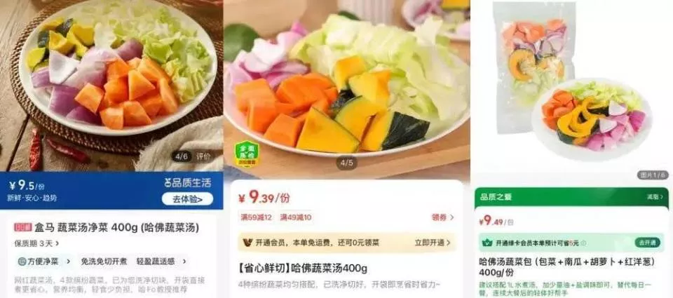 如今,在盒马、叮咚买菜等一系列生鲜超市都有“哈佛蔬菜汤”的净菜售卖,食材包总重均400g,包含洗净切好的胡萝卜、南瓜、卷心菜和洋葱,售价在9.39-9.5元/份,销量和复购率都不低,可见大家对健康的需求有多迫切。