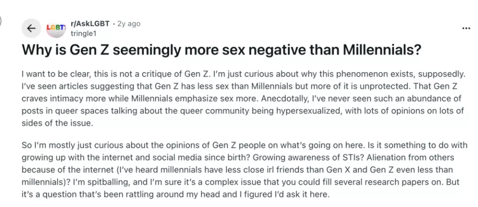 Reddit上的一篇热帖:为什么Z世代比千禧世代对待性更消极?