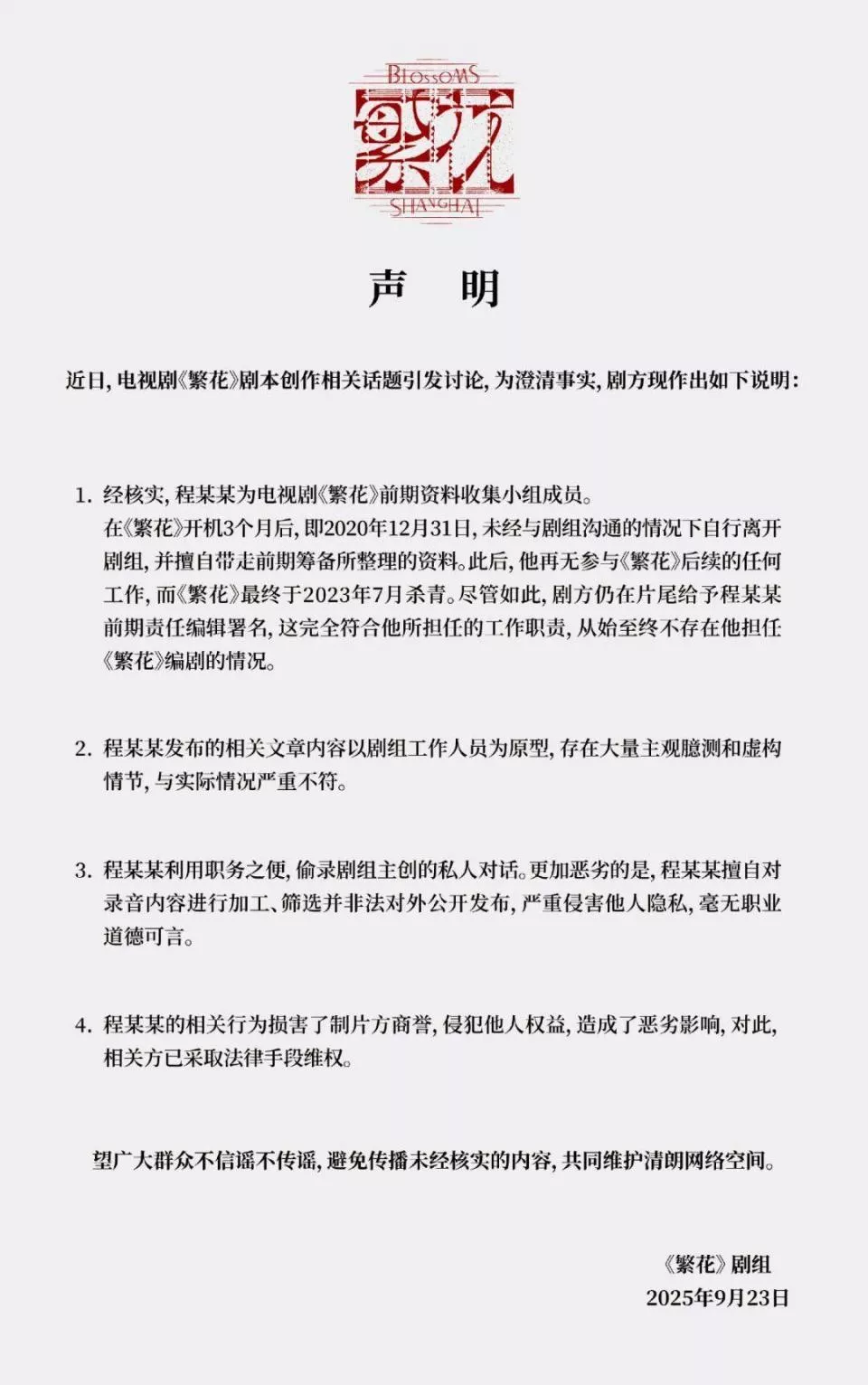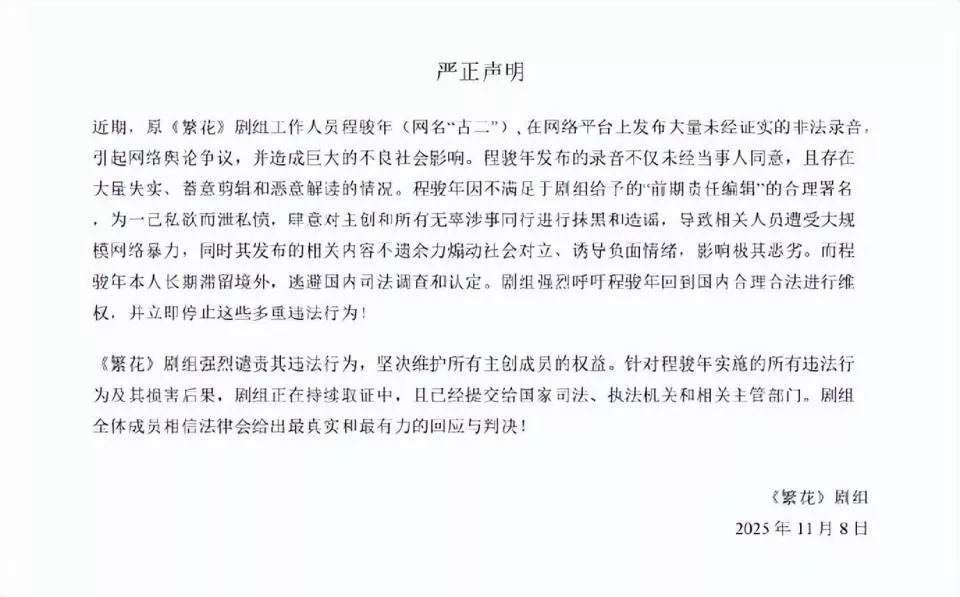 近期,原《繁花》剧组工作人员程骏年(网名“古二”),在网络平台上发布大量未经证实的非法录音引起网络舆论争议,并造成巨大的不良社会影响。程骏年发布的录音不仅未经当事人同意,且存在大量失实、蓄意剪辑和恶意解读的情况。程骏年因不满足于剧组给予的“前期责任编辑”的合理署名,为一己私欲而泄私愤,肆意对主创和所有无辜涉事同行进行抹黑和造谣,导致相关人员遭受大规模网络暴力,同时其发布的相关内容不遗余力煽动社会对立、诱导负面情绪,影响极其恶劣。而程骏年本人长期滞留境外,逃避国内司法调查和认定。剧组强烈呼吁程骏年回到国内合理合法进行维权,并立即停止这些多重违法行为!