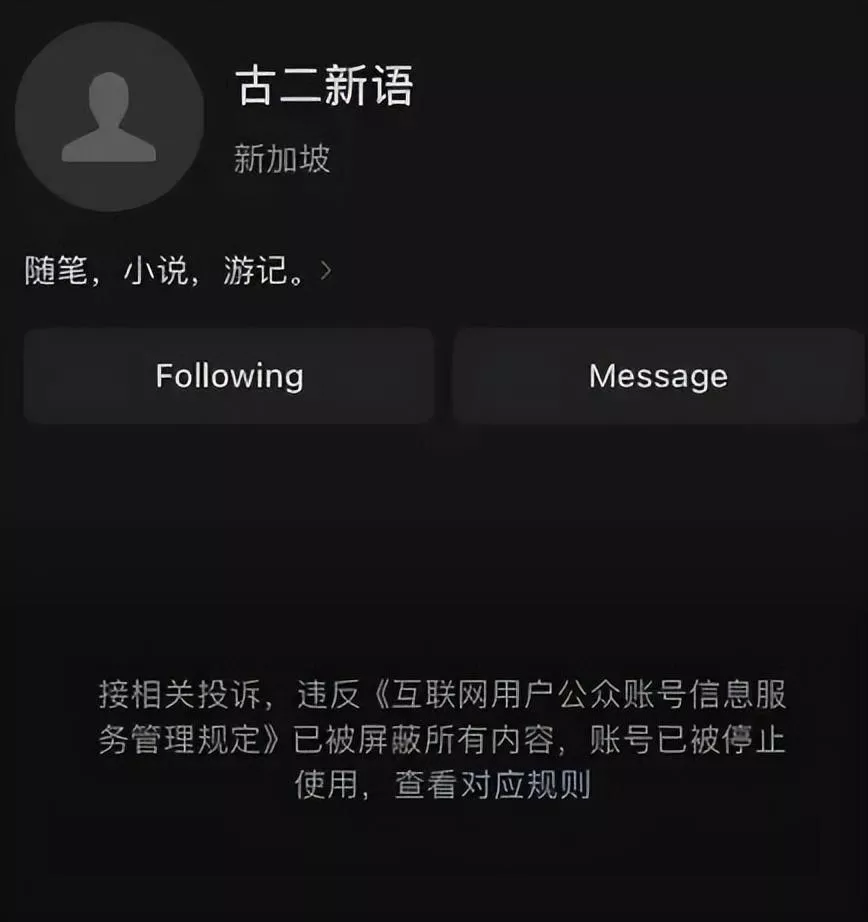 另据红星新闻报道,9月23日下午,编剧“古二”的微信公众号“古二新语”被封,多名此前关注了该账号的用户表示已收到该账号被屏蔽通知,当前微信中已不可搜索到“古二新语”账号。