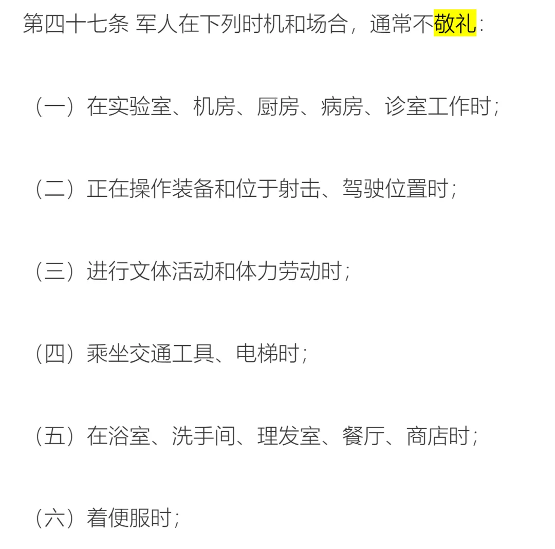 比如《中国人民解放军内务条令》四十七条就有规定,乘坐交通工具和电梯的时候,不需要敬礼。