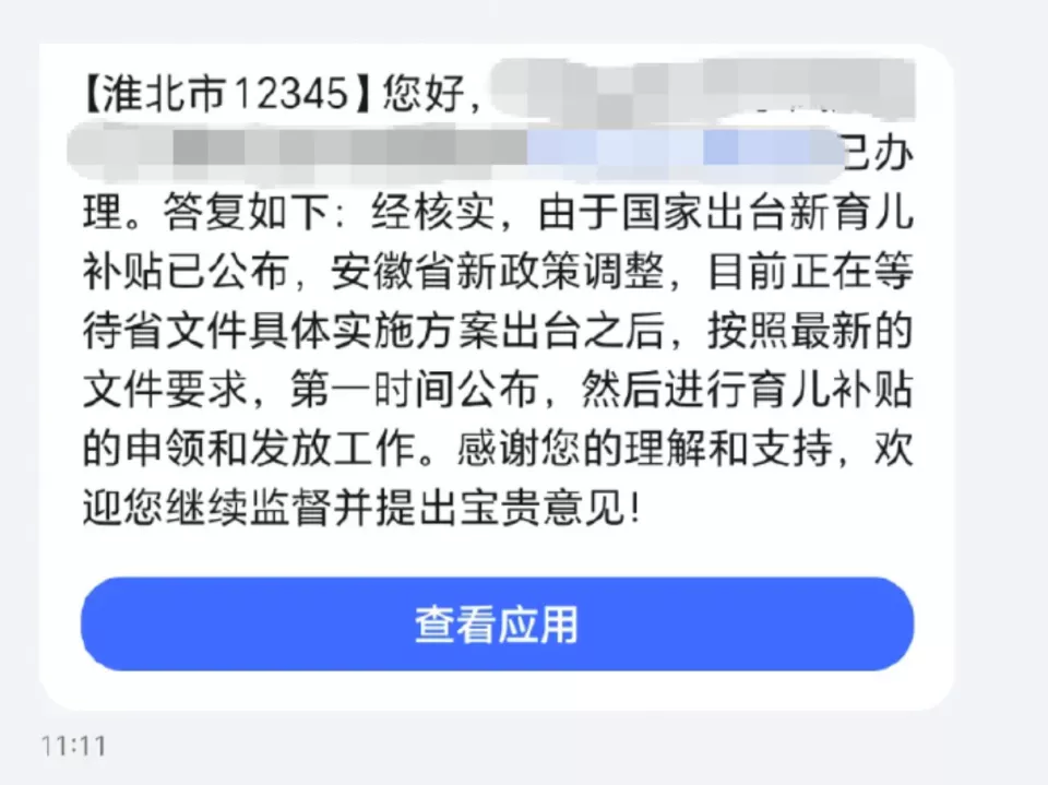 她去打六安市12345市长热线,对方回复:“省内所有二胎补贴全部追回,已发放的从育儿津贴里扣除,没发放的直接截回。”