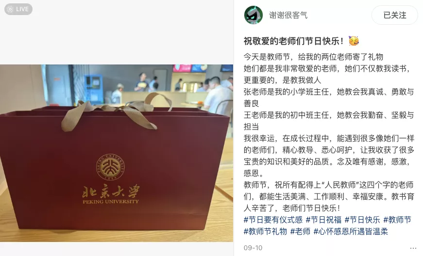教师节那天,谢谢给自己的小学和初中班主任寄去了北大的月饼礼盒。他把和老师们的对话截图发到社交平台上,配文是:“祝所有配得上‘人民教师’这四个字的老师们,都能生活美满、工作顺利、幸福安康。”