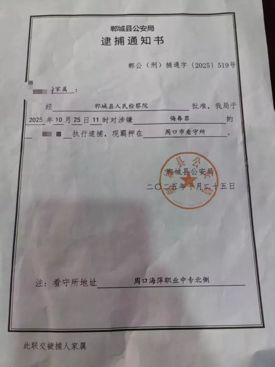 自杨某某被取保候审以来,晋某多次向公检法反映有关杨某量刑的问题。郸城县公安局于今年9月28日出具的拘留通知书显示,杨某某涉嫌侮辱罪被刑事拘留,10月25日经郸城县检察院批准,执行逮捕,现羁押于周口市看守所。