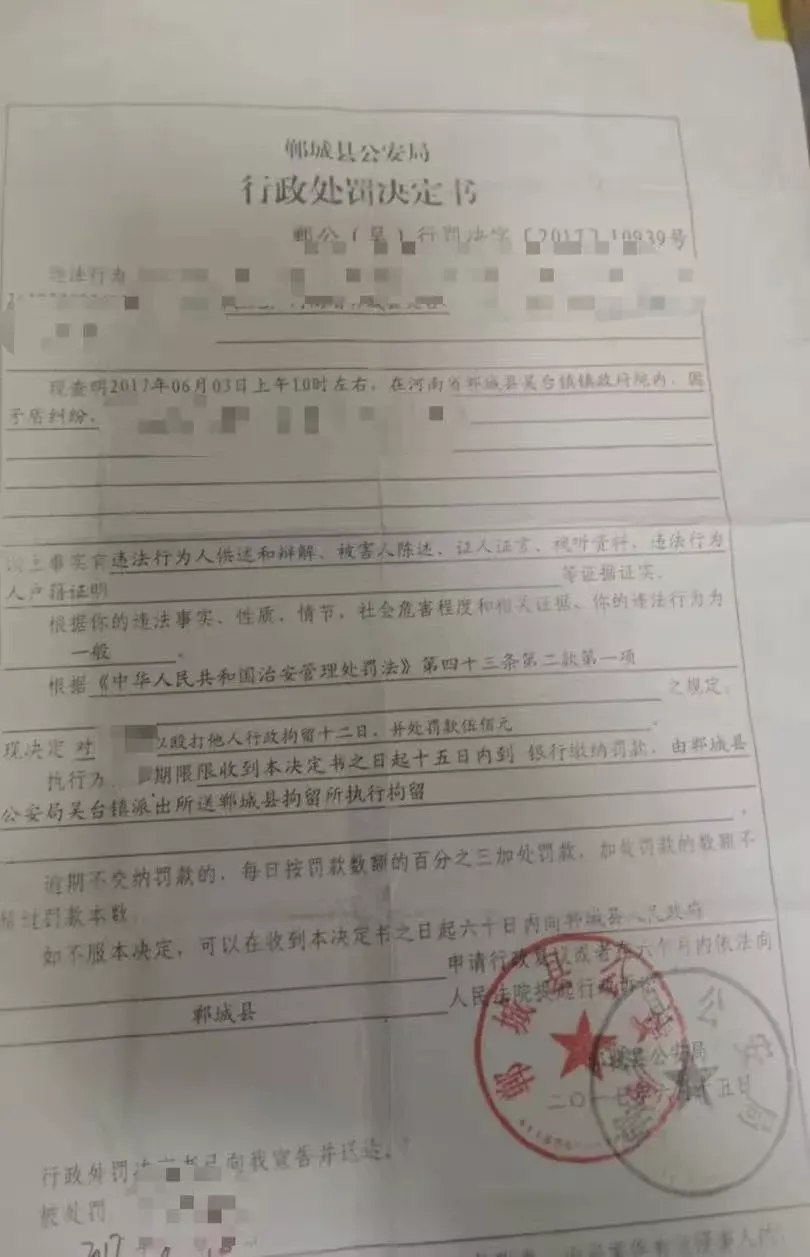 2017年,杨某某因殴打他人被处以行政拘留15日并罚款500元 图/受访者提供