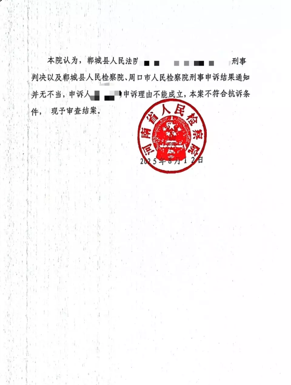 晋某多次申诉后,河南省人⺠检察院于2025年8月出具的刑事申诉结果通知书 图/受访者提供