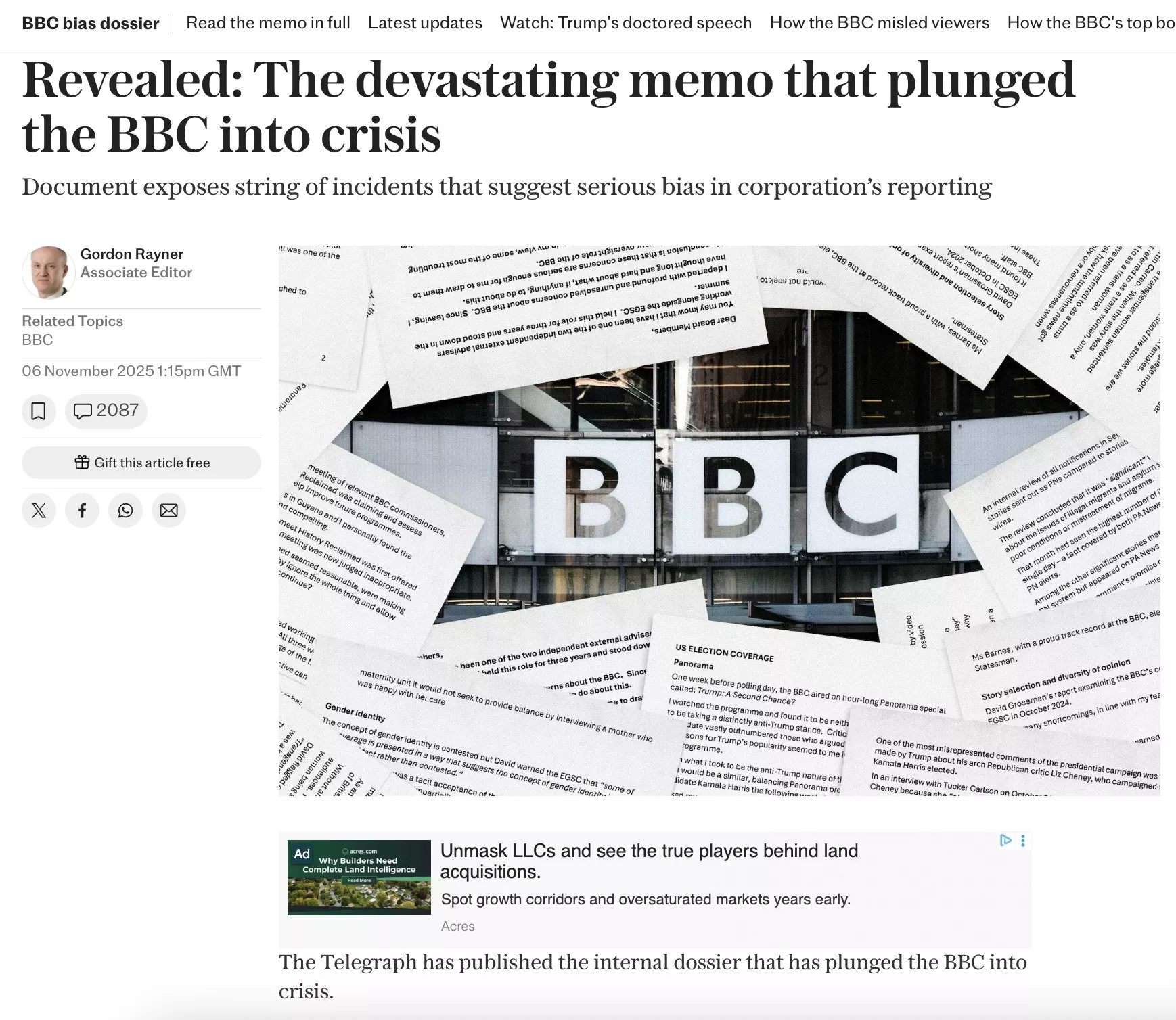 Leavitt)11月7日跳进这场争议,批评BBC是“100%虚假新闻”,指英国纳税人“被迫要为左翼宣传机器埋单”。