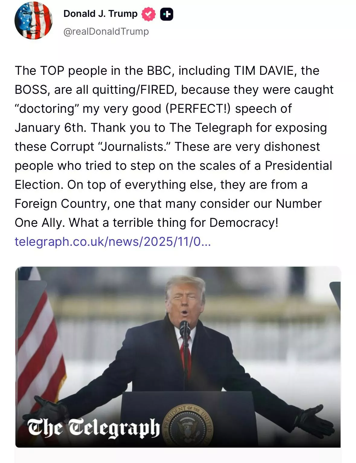 11月9日,特朗普在社交媒体写道:“BBC高层,包括其老板戴维在内,都辞职/被解雇了,因为他们被发现篡改了我1月6日那篇精彩绝伦(完美!)的演讲稿。感谢《每日电讯报》揭露了这些腐败的『记者』。”(Truth