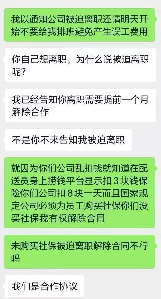 想走也没那么容易。11月1日,有名深圳的配送员提出离职,想以未给员工购买社保为由,解除合同。站长回复说要提前一个月申请,还说“我们是合作协议”,根本没有合同。
