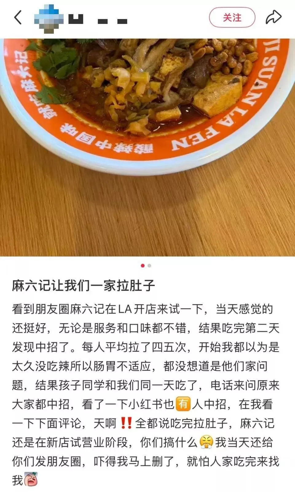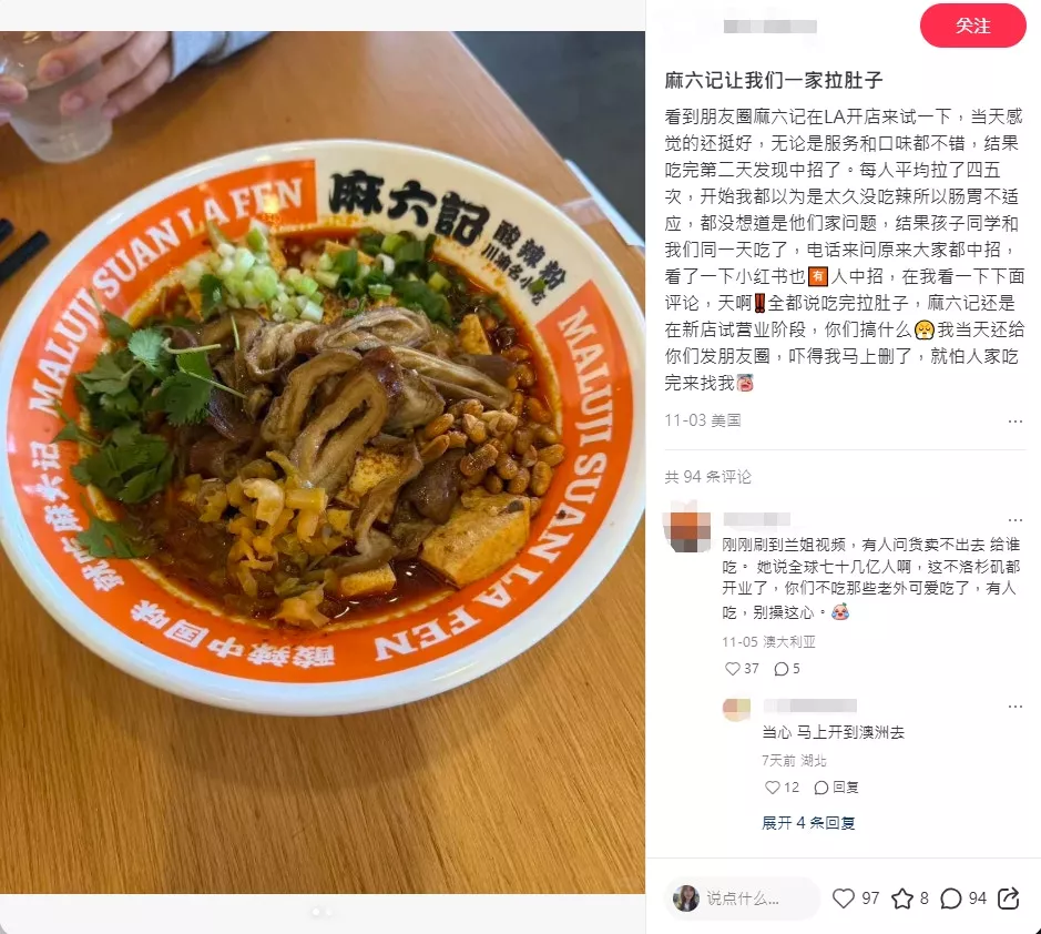大S前夫汪小菲创立的餐饮品牌“麻六记酸辣粉”于10月28日在美国洛杉矶正式开业,然而开业没多久,便陷入食安风波,关门整改。有消费者在社交平台投诉,就餐后出现腹痛、腹泻等身体不适症状,形容“肚子绞痛到一直跑厕所”“腹泻到没力气出门”。