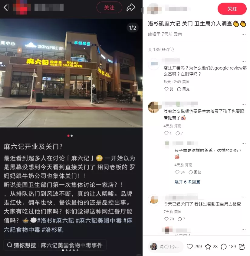 截至目前,麻六记官方还未回应事件。不过,小红书上一个名为“麻六记酸辣粉洛杉矶钻石广场店”的账号在相关投诉帖下方留言致歉,表示对近期部份顾客反馈的情况,深感抱歉,也非常重视。经洛杉矶卫生部门检查,是因店内冷藏设备存在温度波动导致,目前已完成设备检修全面整改,将对11/1-11/3期间所有顾客提供退款。