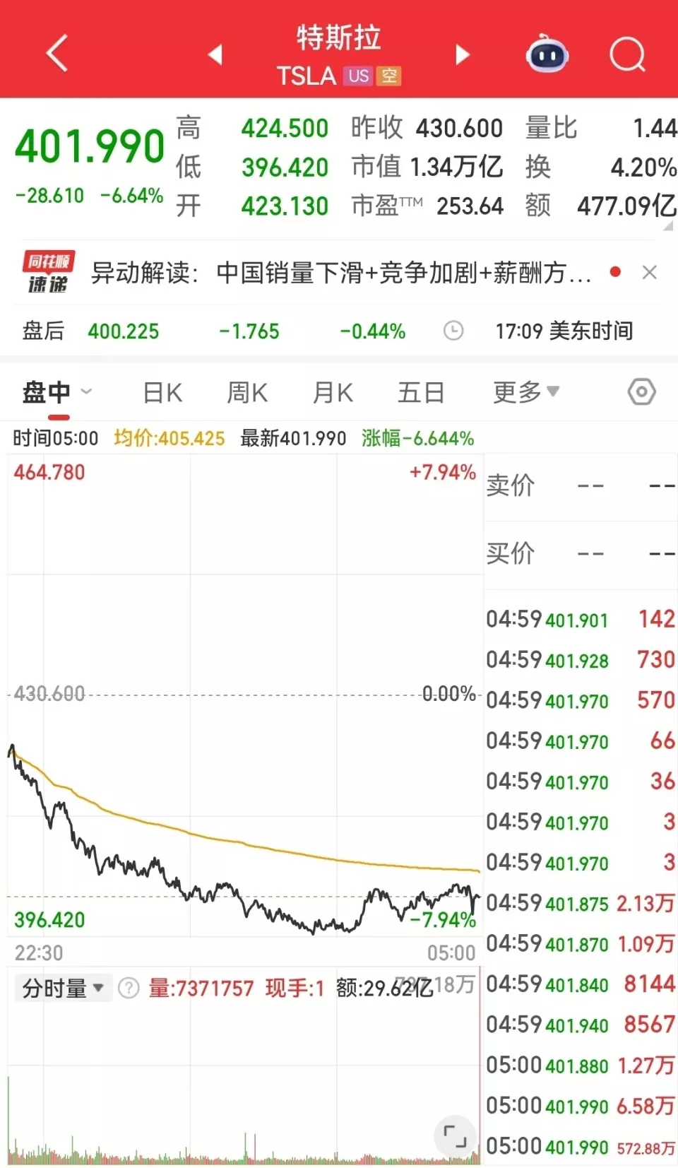 截至当地时间11月13日美股收盘,特斯拉报401.99美元,跌幅6.64%,其市值一夜蒸发952亿美元(约合人民币6755亿元)。