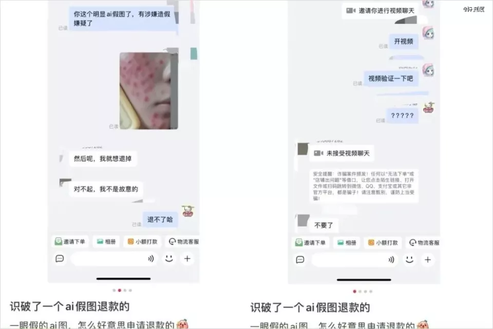 就是在双十一期间,大家都知道,退货率肯定会变高,然后,就有很多人,用AI来P图,骗商家“仅退款”。