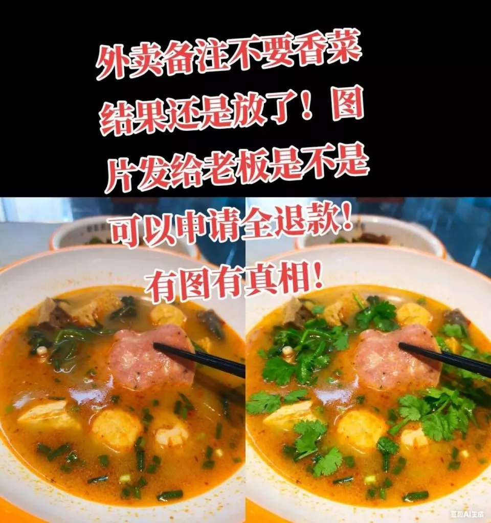 点外卖,备注不要香菜,老板记住了,没有放,外卖拿到手以后,用AI
