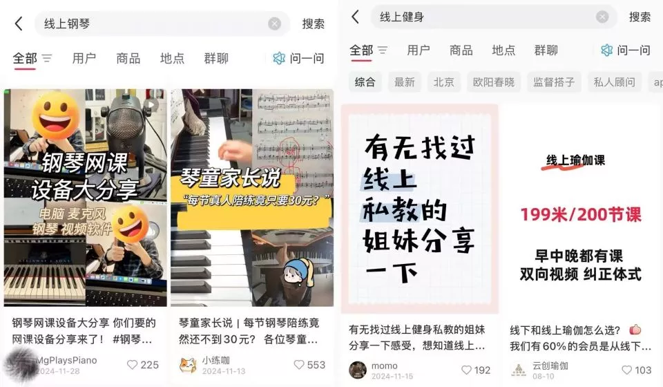 打开小红书、B站,只要搜索“插画老师推荐”“钢琴课种草”“线上瑜伽”等关键词,立马能翻出一整个菜市场的选项: