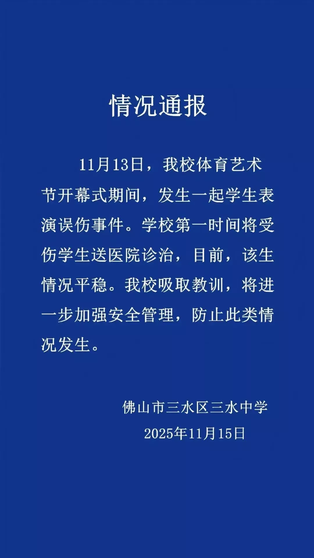 11月13日,我校体育艺术节开幕式期间,发生一起学生表演误伤事件。学校第一时间将受伤学生送医院诊治,目前,该生情况平稳。我校吸取教训,将进一步加强安全管理,防止此类情况发生。