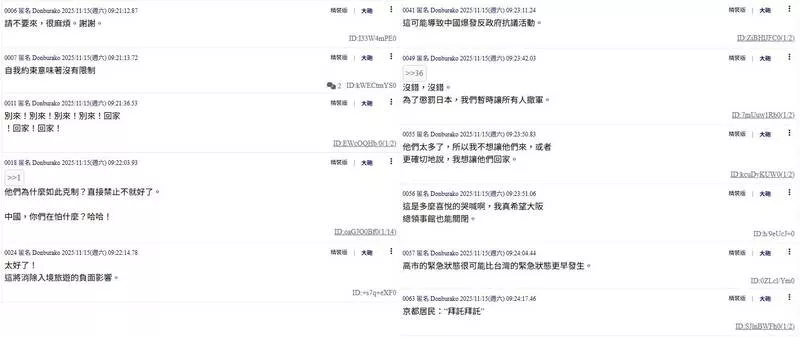 日本首相高市早苗近日发表“台湾有事”言论,中国驻大坂总领事薛剑回以“斩首”争议发言,引发中、日关係紧张。中国外交部今日突然发出通知,呼吁中国民众暂时勿前往日本,相关新闻在日本最大网络论坛5ch冲上热门讨论榜。不少网友留言:“请不要来,谢谢。”、“中国可以直接禁止没关係”。