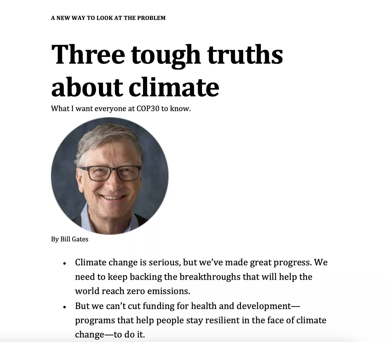 Gates)在个人网站上发表了一篇题为《关于气候的三个残酷真相》(Three Tough Truths About