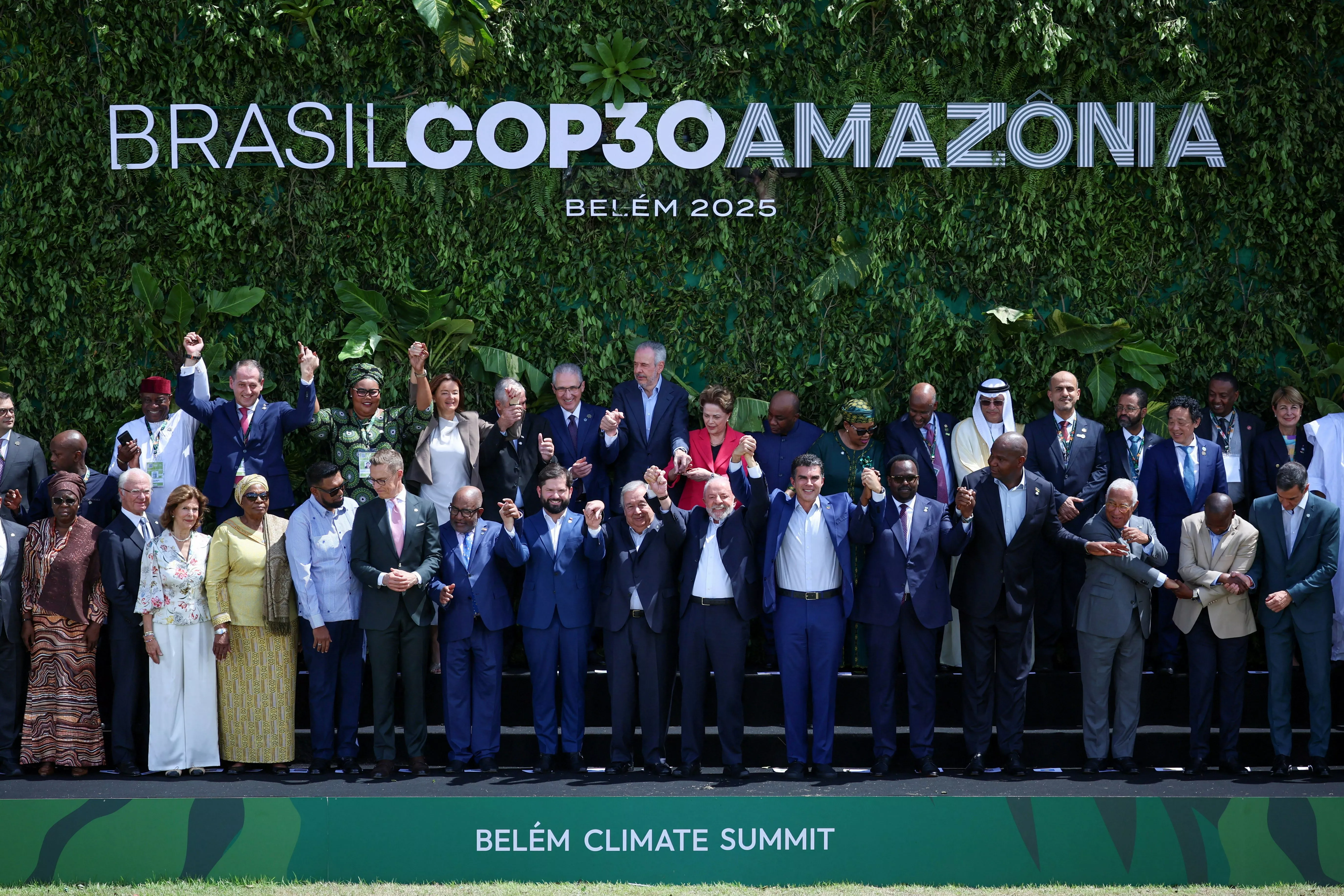 2025年11月7日,在巴西贝伦举行的联合国气候变迁大会(COP30)前夕,巴西总统卢拉、联合国秘书长古特雷斯等人出席贝伦气候峰会时合影(Reuters)