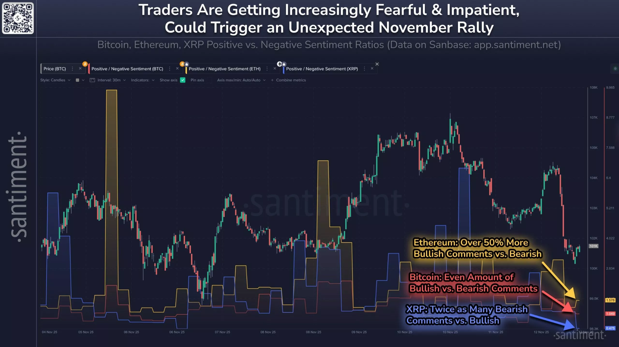 市场情绪分析平台Santiment的最新报告显示,比特币、以太坊和XRP三大加密货币的负面讨论急剧上升,情绪水平远低于正常值。然而,该机构将这种极端悲观视为潜在的看涨信号,认为市场正接近投降阶段。