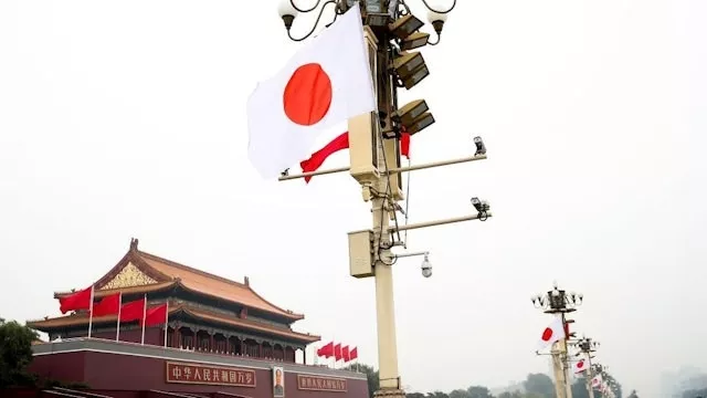 图为2018年10月25日,中国北京天安门广场有中日两国国旗飘扬,欢迎时任日本首相的安倍晋三访华。(Getty)