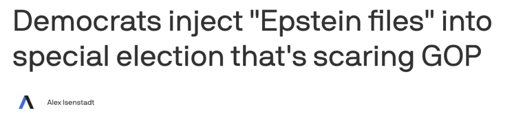 △美国数字新闻网站Axios报道,民主党人希望公布爱泼斯坦档案的立场,能够帮助分裂保守派阵营的选票
