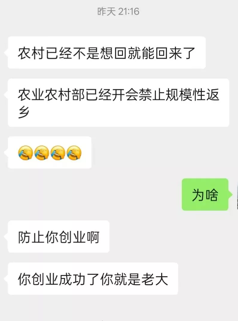 很多人的口吻,都是在嘲讽,都是在日撅——噢,以前说是衣锦还乡,后来说是欢迎返乡创业,现在,你们开始防止我们回乡了。