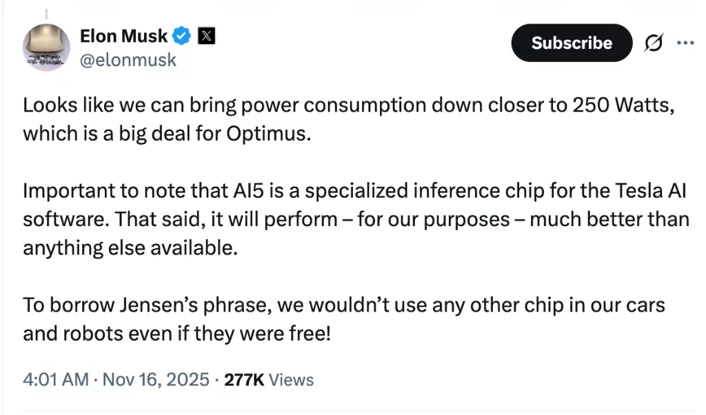 在最新社交媒体动态中,马斯克透露,其团队已于周六完成AI5芯片的设计评审,并已同步启动AI6芯片的早期研发工作。他强调,AI5是专为特斯拉AI软件定制的推理芯片,功耗降至250瓦左右,这对Optimus来说至关重要。在特定应用场景下性能将全面优于市场上任何其他芯片方案。