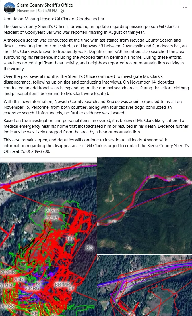 塞拉县警察局表示,失踪者吉尔·克拉克(Gill Clark)于8月14日报失踪。最后一次有人见到他,是在朋友将他送至唐尼维尔(Downieville)镇后离开。当时距离他所居住的古德伊尔斯巴吧(Goodyears Bar)约四英里。由于克拉克平日喜欢步行往返两地,家属最初怀疑他可能在途中迷路或发生意外。