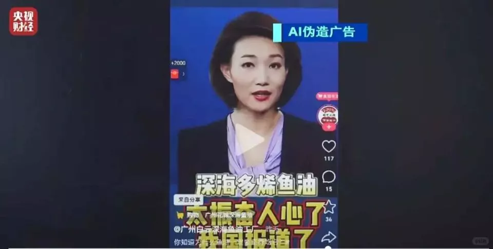 央视主持人李梓萌,被伪装在直播间推销鱼油,背景板还贴上了“央视推荐”。