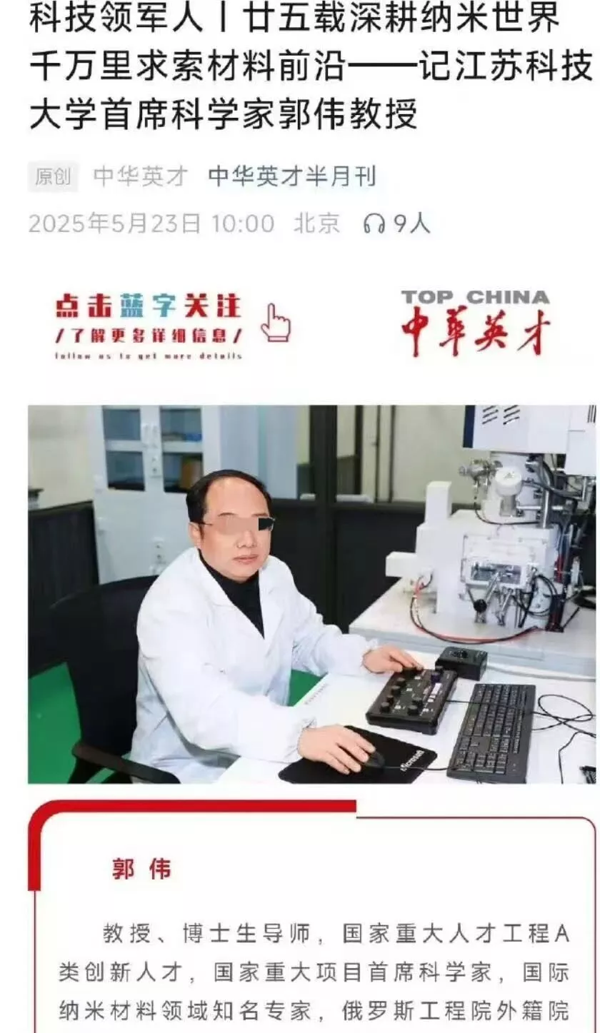 公开资料显示,郭某曾任江苏科技大学首席科学家,是国家重大人才工程A类创新人才、美国金属材料学会杰出科学家。其长期专注于纳米结构材料、亚稳材料、高性能复合材料等前沿领域研究,发表SCI论文180余篇。