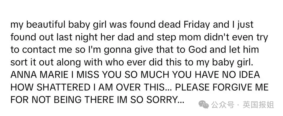 她的父亲和继母甚至没有试图联系我,所以我只能把这一切交给上帝,让他去处理,包括对我宝贝女儿做下这种事的人。
