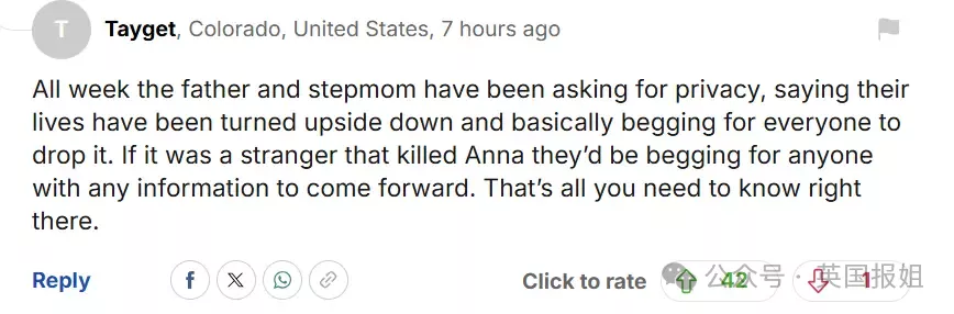 “整整一周以来,安娜的父亲和继母一直在要求大家给他们隐私,说他们的生活被彻底颠覆了,基本上就是在求大家不要再讨论这件事。