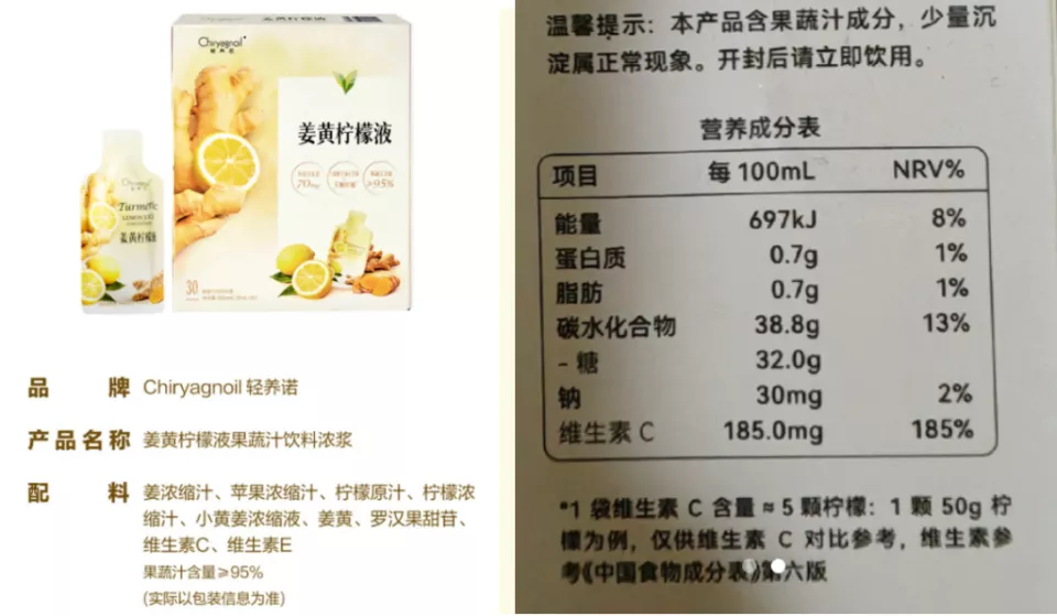 山姆姜黄柠檬液配料表显示,每100ml糖含量高达32g。30ml小包含糖量近10g,一天两袋,糖量轻松超标。