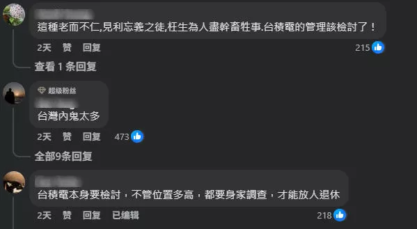有网民担忧台湾未来,“台湾如果没有台积电就真的什么都不是了”;有人怒喷罗唯仁“卖台”,“台湾内鬼太多”,同时要求台积电“深刻检讨”……