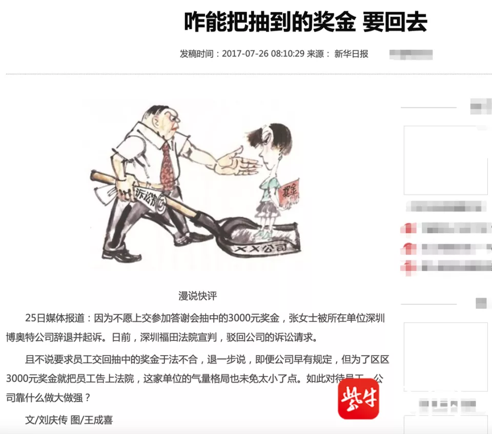 早在2017年,《新华日报》就曾报道过一起相似的案例。某公司法定代表人谢某因事无法参加客户答谢晚宴,委托员工张某代为参加。晚宴上,张某手中的奖券中了一等奖3000元现金。事后公司辞退并起诉张某要求返还奖金,理由是张某是代表公司出席。