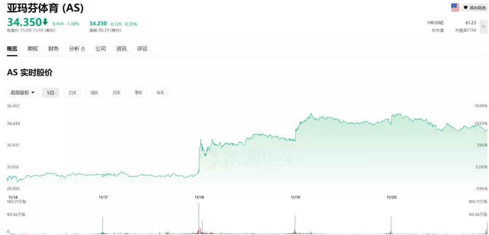 直到亚玛芬体育三季度财报展现出强劲的业绩韧性,才打消了部分市场疑虑,推动股价持续回升:截至11月20日美股收盘,亚玛芬体育股价报收34.35美元/股,微跌1.18%。但在财报发布前一交易日,其股价大涨8.45%,财报发布后一日,再度攀升4.2%,总市值达到192.77亿美元,已接近“炸山”风波前的市值水平。