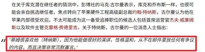 而且有人跟彭博社透露,说库克本人也很喜欢他,虽然是硬件出身,但他上台演讲做得不错,性格也很好,从来不在邮件中加上任何有争议的词汇,决策也非常谨慎。