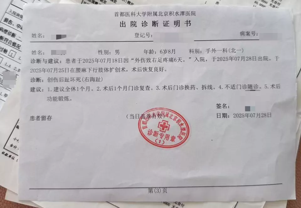 “去医大二是为了给航航接血管,接完后我们发现脚趾头效果不理想。”高女士说,不久后,他们又带着孩子前往了北京治疗。首都医科大学附属北京积水谭医院提供的出院诊断证明书显示,7月18日,航航因“外伤致右足疼痛6天”入院,“创伤后趾坏死”,“见趾骨基底离断处骨骺分离,骨折移位”,7月25日在腰麻下行肢体扩创术,术后恢复良好,于7月28日出院。