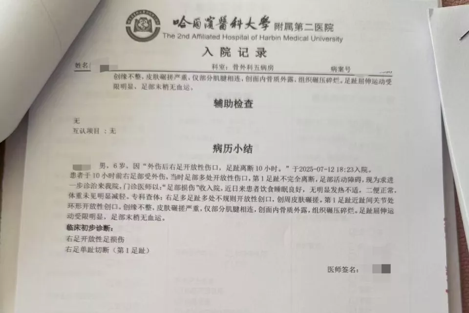 在医大二的入院记录中,记者看到,航航于7月12日18点23分入院,10小时前右足部受外伤,当时足部多处开放性伤口,第1足趾不完全离断,足部活动障碍,后以“足部损伤”收入院。专科查体显示“皮肤碾搓严重,仅部分肌腱相连,创面内骨质外露,组织碾压碎烂”,其入院诊断为“右足开放性足损伤,右足单趾切断(第1足趾)”。