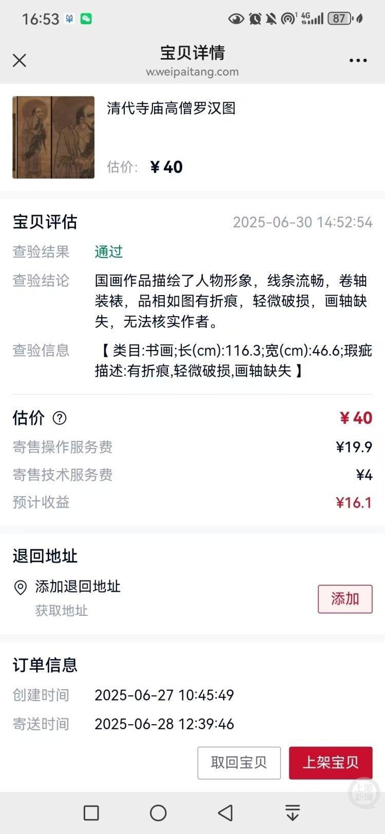 画作重新寄售后估价为40元。 图片来源/受访者供图