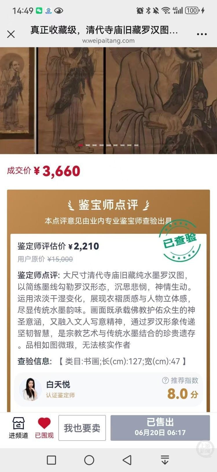 [email protected])记者,今年6月19日,他在微拍堂APP上以3660元竞拍的“清代罗汉图”