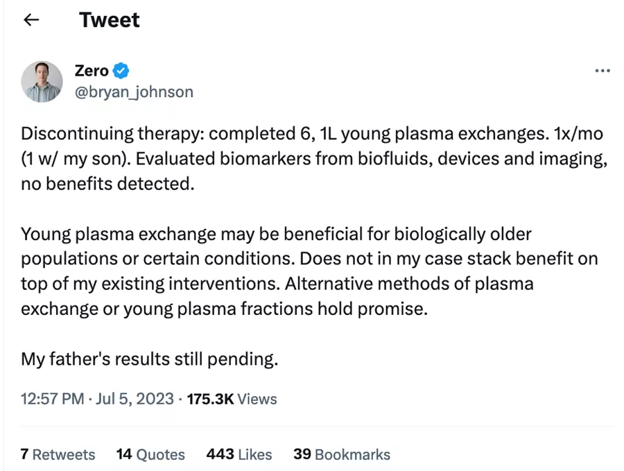 更让人咋舌的是硅谷富豪布莱恩.约翰逊的“亲自试水”。这位身家亿万的科技企业家,为了“逆龄”启动“蓝图项目”,每年花200万美元组建30人医疗团队,其中就包括每月 1 升的年轻血浆输注,甚至还和 17 岁儿子、70 岁父亲搞起 “三代换血”:儿子的血浆输给自己,自己的血浆再输给父亲。但经过6次输注后,他公开承认“各项生物指标无任何益处”,彻底终止了这项操作。