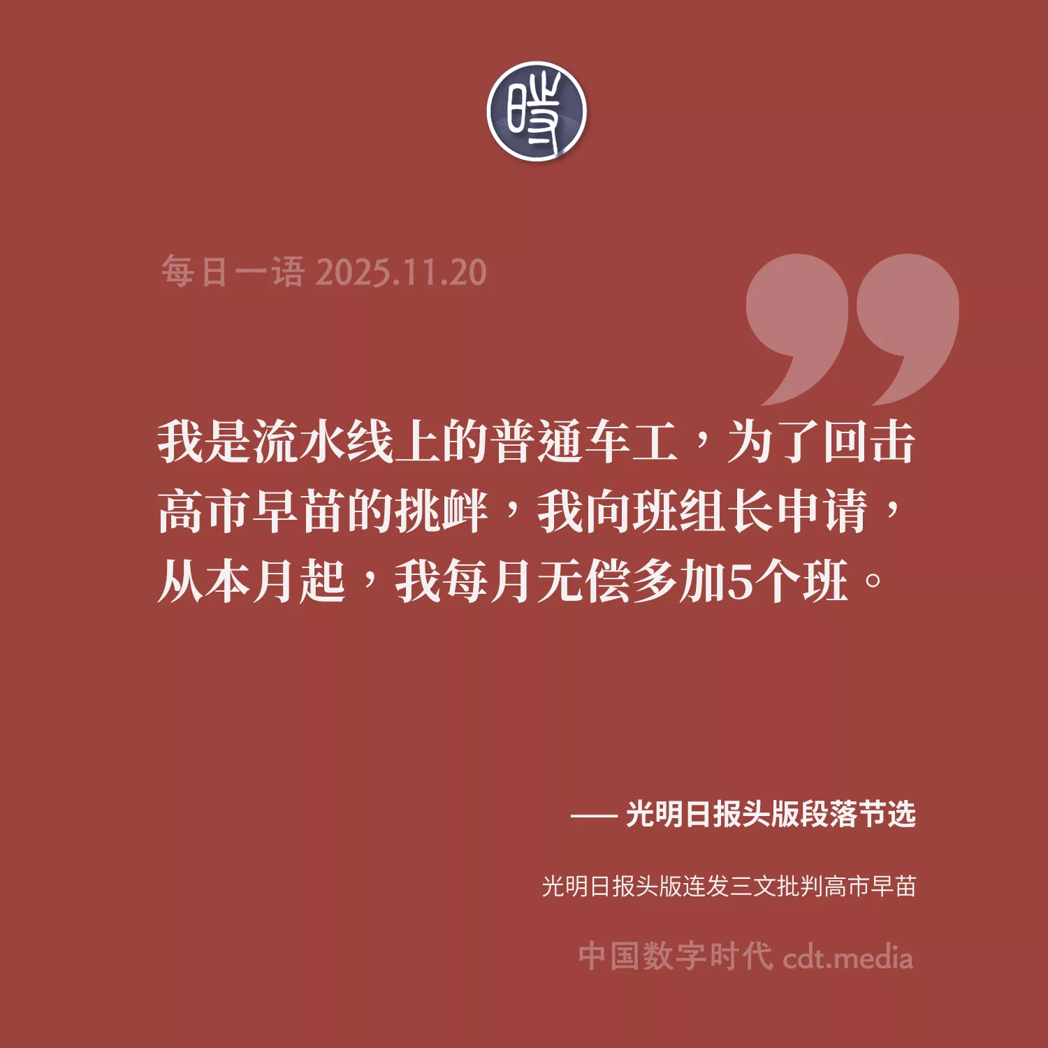 “我是流水线上的普通车工,为了回击高市早苗的挑衅,我向班组长申请,从本月起,我每月无偿多加5个班。”