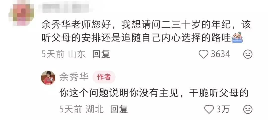 有网友问:请问二三十岁的年纪,该听父母的安排,还是追随自己内心选择的路?