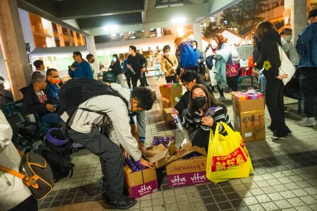 入夜之后,宏福苑外有不少大埔居民自发组织物资,派发水、食物、棉被等给予被疏散及受到影响的市民。