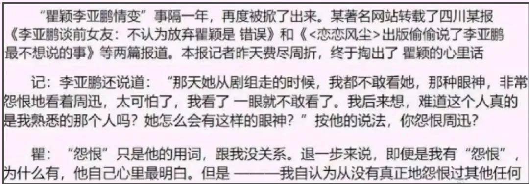 ——瞿颖被分手了跨城找朋友哭诉,周迅被分手了抑郁许久,李亚鹏和瞿颖、周迅纠缠期间,还有过一篇经典报道,李亚鹏竟然暗示记者,瞿颖非常怨恨周迅,来了一句:“……我都不敢看她,那种眼神,非常怨恨地看着周迅,太可怕了……”